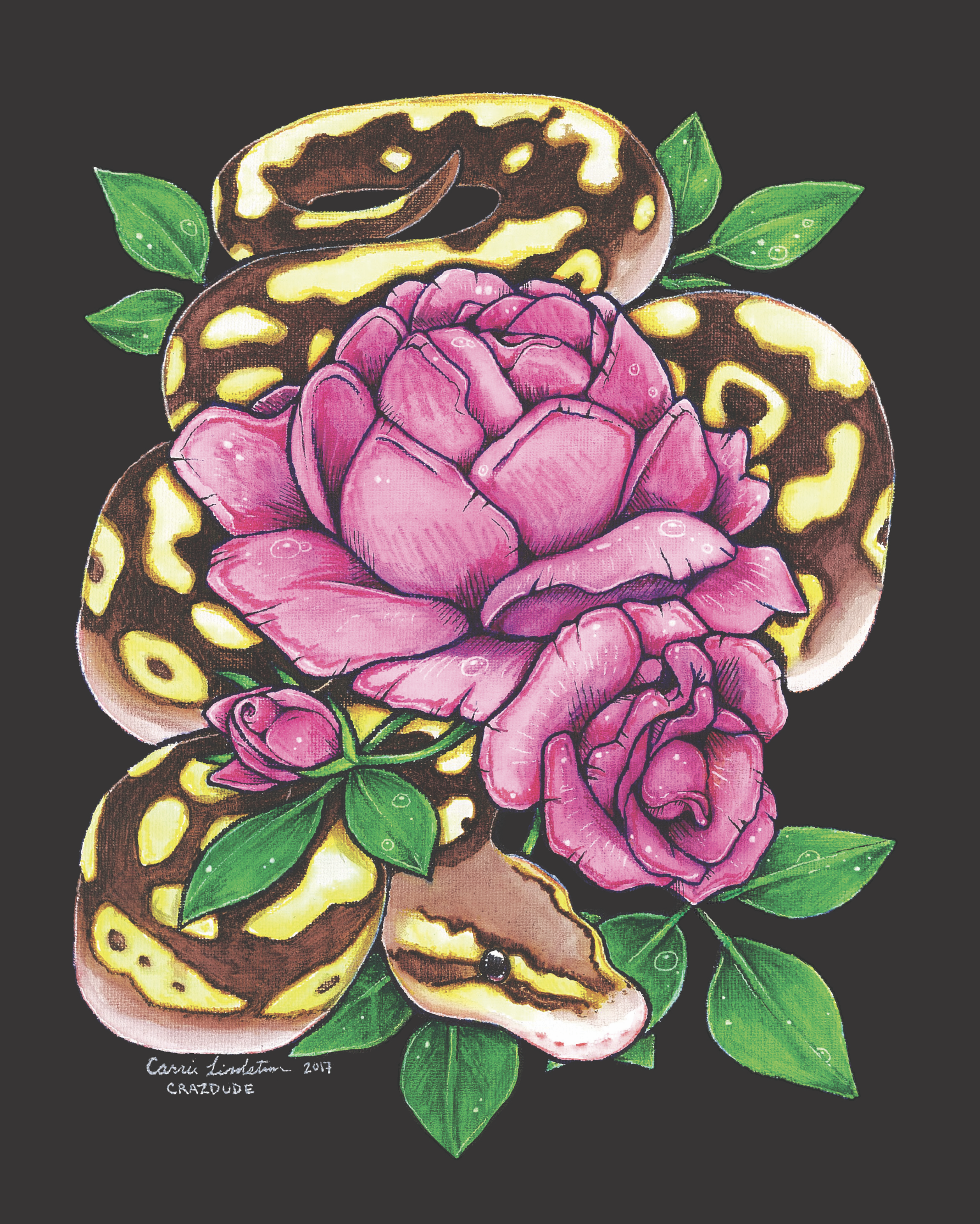 Most appreciate the beauty of a rose but what shy beauty lies beneath this flower? A ball python! This experimental piece was drawn and colored entirely in Sharpie marker on 11×14 canvas. This print (available in 11×14 or 8×10 size to fit standard frames and mats) captures the subtle texture of the canvas.